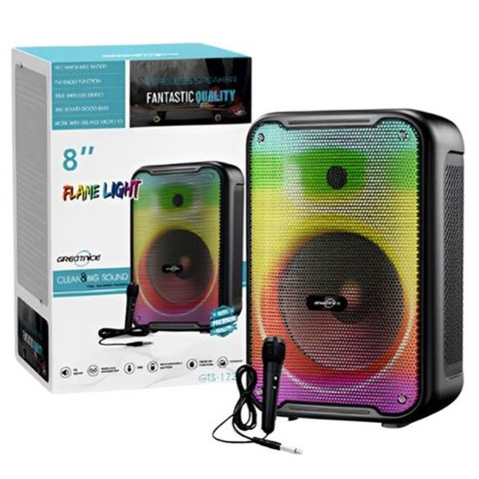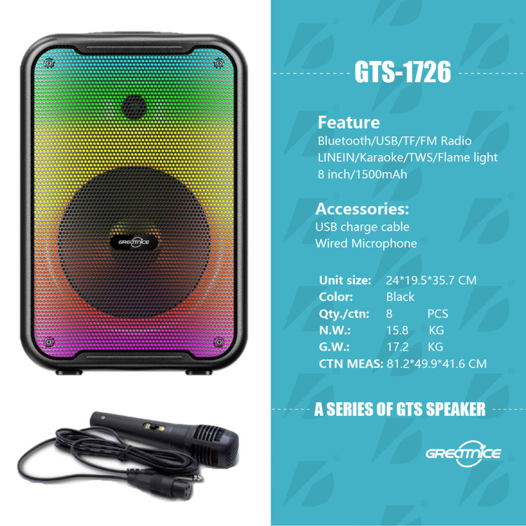 اسپیکر قابل حمل gts 1726یک اسپیکر جمع و جور ولی با صدایی فوق العاده بلند و با کیفیت است که دارای یک ساب 8 اینچی و یک تیوتر 1 اینچی می باشد که می تواند صدایی با قدرت 3000وات پمپو را تولید کند.این اسپیکر از بلوتوث ورژن 5 پشتیبانی کرده و دارای درگاه فلش ، مموری و ای یو ایکس می باشد.این اسپیکر دارای پارتی لایت بسیار زیبا و حساس به صدا است که می توانید آن را به چند حالت مختلف تغییر دهید همچنین بر روی پنل این اسپیکر کلیدی مجزا به اسم BASS تعبیه شده که با روشن کردن آن باس دستگاه چند برابر خواهد شد.داخل باکس این اسپیکر یک عدد میکروفن با سیم قرار دارد که می توانید توسط آن لحظات مفرحی رو به خوانندگی و شنیدن موسیقی بپردازید.