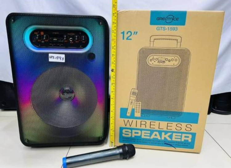 اسپیکر قابل حمل GTS 1593 یک اسپیکر پرتابل ولی با صدایی فوق العاده بلند و با کیفیت است که دارای یک ساب 12 اینچی و یک تیوتر 1 اینچی می باشد که می تواند صدایی با قدرت 3500 وات پمپو را تولید کند.این اسپیکر از بلوتوث ورژن 5 پشتیبانی کرده و دارای درگاه فلش ، مموری و ای یو ایکس می باشد.این اسپیکر دارای پارتی لایت اکلایزری بسیار زیبا و حساس به صدا است که می توانید آن را به چند حالت مختلف تغییر دهید همچنین بر روی پنل پشتی این اسپیکر ولوم های تنظیم کننده کامل تعبیه شده که توسط انها قادر به تنظیم صدای اسپیکر و میکروفن خواهید بود.داخل باکس این اسپیکر یک عدد میکروفن با سیم قرار دارد که می توانید توسط آن لحظات مفرحی رو به خوانندگی و شنیدن موسیقی بپردازید.