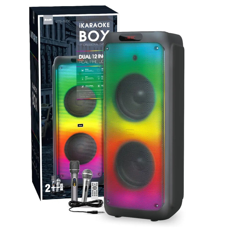 و با صدای موزیک هماهنگ هست قابلیت استفاده با برق مستقیم و باتری دارای پورت USB مموری AUX دو پورت میکروفن و یک پورت گیتارا قلام همراه دو میکروفون بیسیم و با سیم