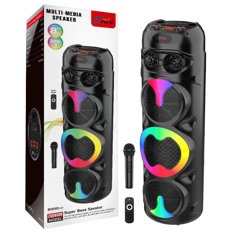 اسپیکر قابل حمل zqs 8309 یک اسپیکر پرتابل ولی با صدایی فوق العاده بلند و با کیفیت است که می تواند صدایی با قدرت 60وات را تولید کند.این اسپیکر از بلوتوث پشتیبانی کرده و دارای درگاه فلش ، مموری و ای یو ایکس می باشد.این اسپیکر دارای پارتی لایت بسیار زیبا و حساس به صدا است که می توانید آن را به چند حالت مختلف تغییر دهید همچنین بر روی پنل این اسپیکر کلیدی مجزا به اسم EQ تعبیه شده که با روشن کردن آن باس دستگاه چند برابر خواهد شد.داخل باکس این اسپیکر یک عدد میکروفن وایرلس قرار دارد که می توانید توسط آن لحظات مفرحی رو به خوانندگی و شنیدن موسیقی بپردازید.