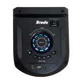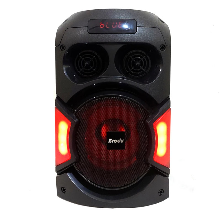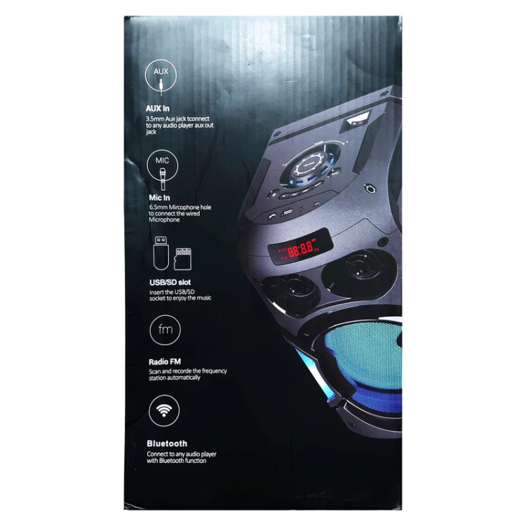 فرکانس ورودی برابر با 100 هرتز الی 20 کیلوهرتز حساسیت سیگنال به نویز برابر با 80 دسی بل نحوه اتصال بی سیم از طریق بلوتوث با برد اتصال تقریبی 10 متر و باسیم توسط رابط جک 3.5 میلی متری صداپخش فایل های ذخیره شده با پشتیبانی از فلش مموری USB و کارت حافظه میکرو SD تا حداکثر حجم 32 گیگابایت جنس بدنه از پلاستیک مقاوم در برابر آسیب های فیزیکی احتمالی همچون ضربه و فشار، دارای دسته جهت حمل و نقل آسان برخورداری از دو عدد درایو 6.5 اینچی و توان خروجی 40 وات (2×20W)، بهره مندی از نشانگر LED جهت نمایش وضعیت شارژ بهره مندی از یک عدد پورت ورودی میکروفون، مجهز به نورپردازی RGB جهت ایجاد جلوه بصری زیبا در مکان های تاریک و کم نورپشتیبانی از TWS به منظور اتصال همزمان به دو یا چند دستگاه، امکان پخش امواج رادیویی FM در بازه ی 87.5 الی 108 مگاهرتز مدت زمان لازم جهت تامین شارژ در حدود 3 الی 4 ساعت و مدت زمان نگهداری شارژ به طور تقریبی برابر با 1 ساعت (با ولوم 75 درصد) تامین انرژی توسط باتری داخلی با ظرفیت 1800 میلی آمپر ساعتی با امکان شارژ مجدد از طریق پورت میکرو یو اس بی با ولتاژ شارژ 5 ولت DC مجهز به کلیدهای فیزیکی تعبیه شده جهت مدیریت موسیقی، تنظیم ولوم، نورپردازی و …، اقلام همراه شامل میکروفون، کابل شارژ میکرو یو اس بی