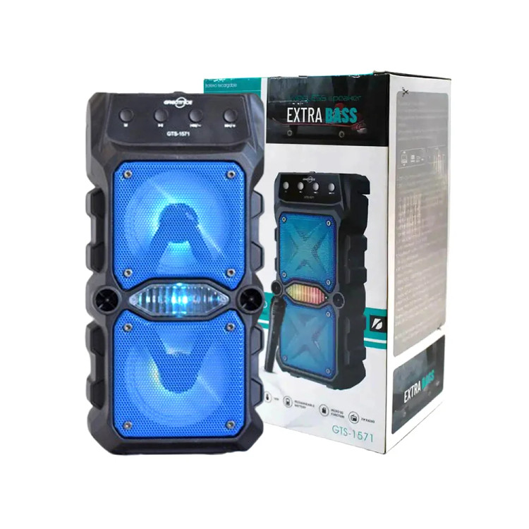 اسپیکر بلوتوثی دو باند همراه با میکروفون GTS-1571 دارای صدای پرقدرت، طراحی زیبا و افکتهای نورانی، مناسب مجالس و مهمانیهاست. با باتری 800 میلیآمپری تا 4 ساعت پخش موسیقی دارد و از بلوتوث، USB، Micro SD و میکروفون پشتیبانی میکند. اسپیکر GTS-1571 برای تولید صدای شفاف در محیطهایی که به صداهای مختلف نیاز است ، طراحی شده و به زبان ساده هر نوع صدایی که میتوان به صورت با کیفیت در محیط شنید را برای شما تولید میکند. اسپیکر GTS-1571 به واسطه توان خروجی بالا؛ صدای پرقدرت و شفافی را در ابعادی وسیع، برای برگزاری مهمانیها و مجالس ایجاد میکند. علاوه بر حجم زیاد صدای خروجی، طراحی زیبا، افکتهای متنوع نورانی و قابل حمل بودن؛ این محصول را به یکی از منحصر به فردترین اسپیکرها تبدیل کرده است. اسپیکر GTS-1571 انرژی مورد نیاز خود را از طریق یک باتری داخلی لیتیوم یونی پر قدرت با ظرفیت 3200 میلی آمپر ساعت تامین میکند که برای پخشموسیقی به مدت 4 ساعت جوابگو هست. شارژ شدن کامل این محصول 3 الی 4 ساعت زمان میبرد که با توجه به ظرفیت بالای باتری زمان بسیار مناسبی هست. اتصال به این اسپیکر به دو صورت باسیم و بیسیم امکانپذیر است. اتصال بیسیم از طریق بلوتوث و اتصال باسیم از طریق USB و Micro SD Card و میکروفون صورت میگیرد. بنابراین با هرکدام از روشهای اتصال، میتوانید به این اسپیکر متصل شوید و موسیقیهای مورد علاقه خود را پخش کنید.