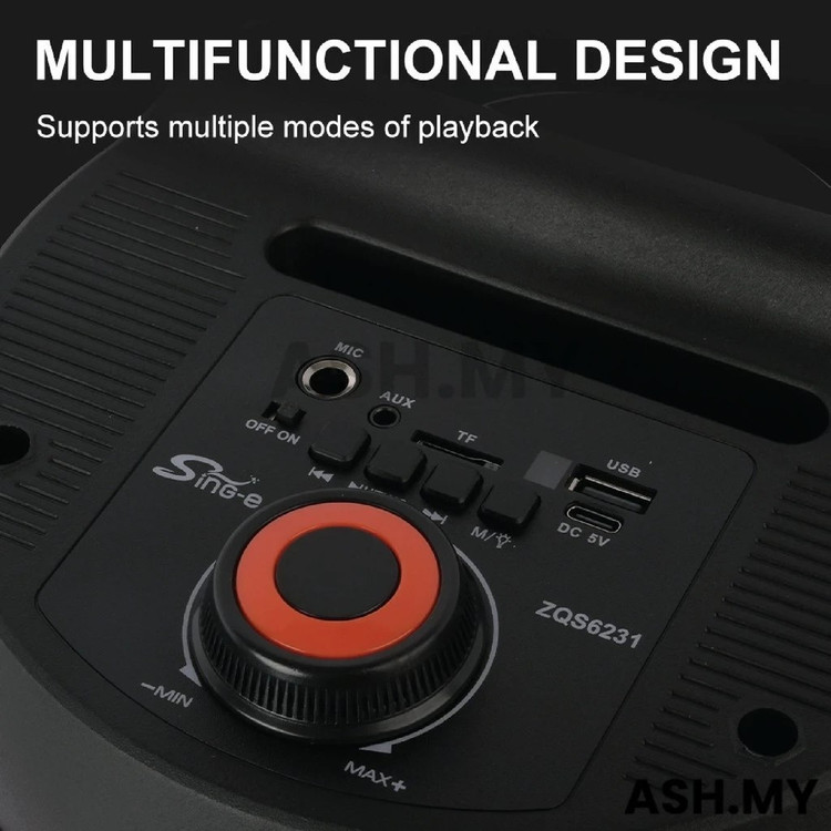 اسپیکر چمدانی بلوتوثی سینگ ای مدل ZQS6231 یک اسپیکر قابل حمل با ویژگی های متنوع است که تجربه ی صوتی باکیفیتی را ارائه می دهد. این اسپیکر همراه با میکروفون و ریموت کنترل عرضه می شود که امکانات بیشتری را برای کاربران فراهم می کند.