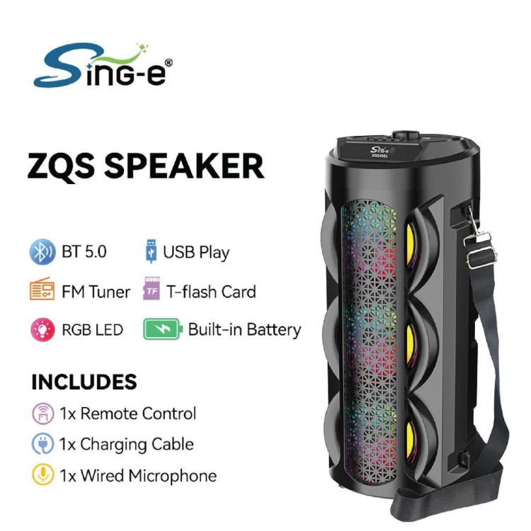 این دستگاه با یک باتری قوی تجهیز شده است که امکان پخش موسیقی بدون وقفه را برای مدت طولانیتری فراهم میکند. این ویژگی آن را برای سفرهای طولانی و استفاده مداوم مناسب کرده است.بلندگوی Sing-e مدل ZQS4303 از اتصال بلوتوث نسخه 5.0، USB و ورودی AUX پشتیبانی میکند و به راحتی با انواع دستگاهها مانند گوشیهای هوشمند و تبلتها سازگار میشود.