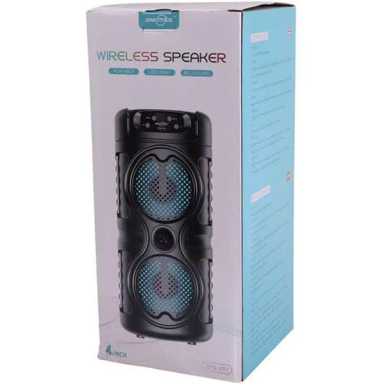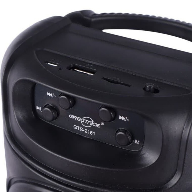 اسپیکر بلوتوثی قابل حمل گریت نایس مدل GTS-2151بدنه ساخته شده از پلاستیک مقاوم، برخورداری از دسته جهت حمل آسان، مجهز به کلید های فیزیکی به منظور مدیریت موسیقی، ولوم، Mood و ...مجهز به 2 عدد درایور 4 اینچی با توان خروجی کلی 10W، میزان حساسیت برابر با 80 دسی بل و پاسخ فرکانسی 100 هرتز الی 20 کیلوهرتز پشتیبانی از فلش مموری USB و کارت حافظه TF تا حداکثر ظرفیت 32 گیگابایت، اتصال بی سیم از طریق بلوتوث با برد اتصال 10 متر تامین انرژی توسط باتری داخلی با ظرفیت 1200 میلی آمپر ساعت، قابلیت شارژ مجدد از طریق پورت MicroUSB و کابل همراه مدت زمان شارژ برابر با تقریبی 2 ساعت و شارژدهی با ولوم 75 درصد در حدود 1 الی 2 ساعت، مجهز به نورپردازی RGB