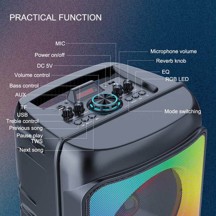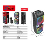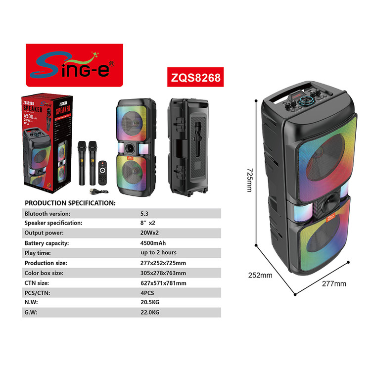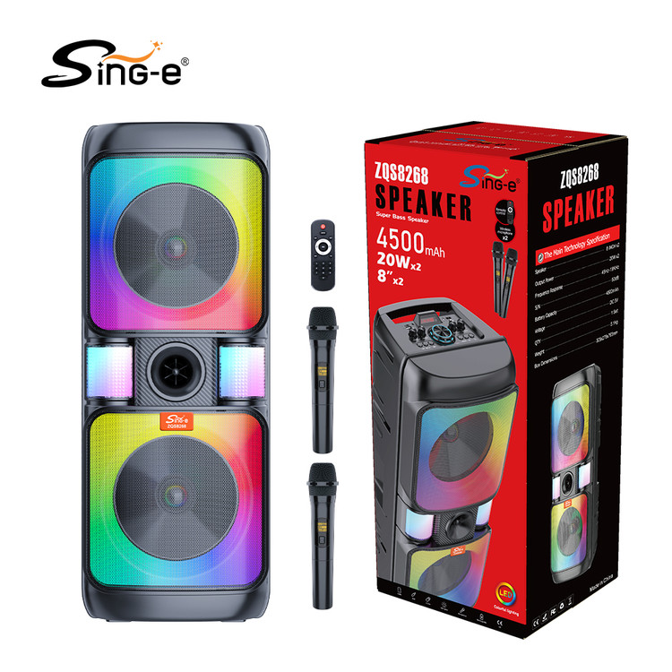 پس از سالها تجربه و تولید محصولات مختلف اینبار شاهد شاهکار بی نظیر شرکت ZQS مدل معروف ZQS 8268 هستیم.این اسپیکر در سال 2022 به عنوان پر فروش ترین محصول این شرکت در کشور ایران برگزیده شد.8268 zqs یک اسپیکر با دو بلندگوی 8 اینچی و یک تیوتر یک اینچی میباشد که قادر به صدایی بسیار بلند و با کیفیت با حجم 4000 هزار وات اسمی می باشد.طراحی ظاهری این اسپیکر بسیار زیبا و ارگونمی می باشد که به راحتی قابلیت حمل و جابجایی را دارد.باتری درون این اسپیکر از ظرفیت بسیار بالای 4500 میلی آمپر برخوردار است که توانایی روشن نگه داشتن این اسپیکر را به مدت حداکثر 6 ساعت دارد.در قسمت فوقانی این محصول پنل کنترل کننده بسیار حرفه ای دیده می شود.همچنین در قسمت پشتی این محصول جایگاهی تعبیه شده که میتوانید با قرار دادن میکروفن بیسیم در آن از گم شدن یا اسیب دیدن میکروفن جلوگیری کنید.یر روی میکروفن این محصول کلید های کم و زیاد کردن و تغییر صدای خواننده(بچه/زن/ پیر مرد) وجود دارد.رقص نور این محصول نیز دارای قابلیت تغییر و خاموش کردن می باشد.در کل 8268 یکی از بهترین گزینه ها ی خرید برای انتخاب یک اسپیکر برای داخل و خارج از منزل می باشد.