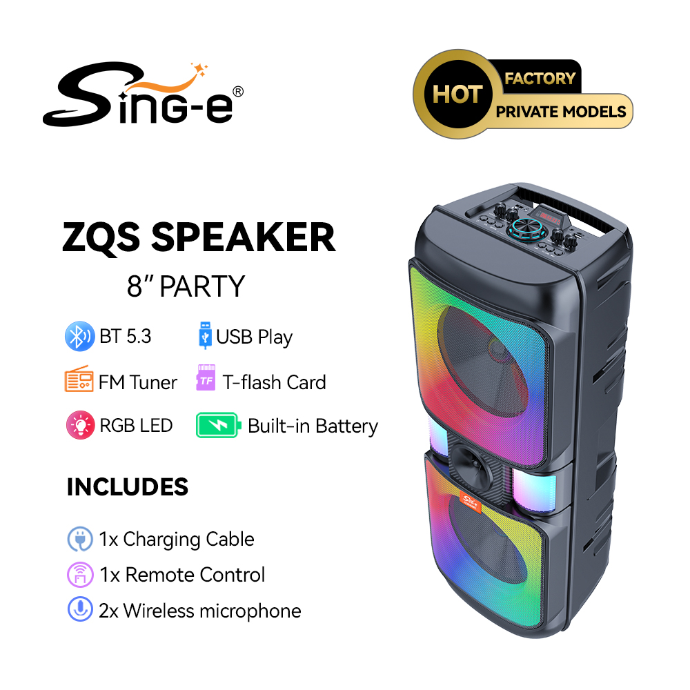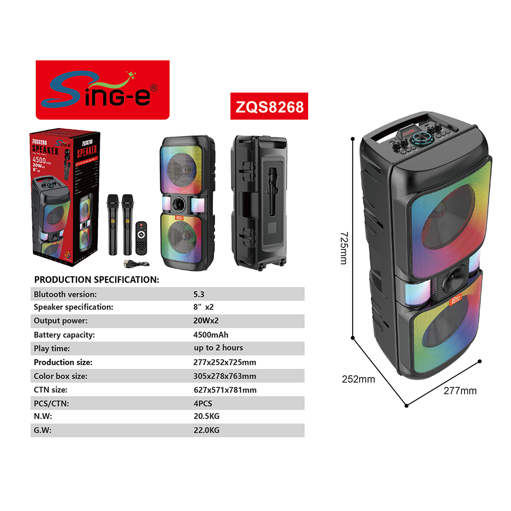 پس از سالها تجربه و تولید محصولات مختلف اینبار شاهد شاهکار بی نظیر شرکت ZQS مدل معروف ZQS 8268 هستیم.این اسپیکر در سال 2022 به عنوان پر فروش ترین محصول این شرکت در کشور ایران برگزیده شد.8268 zqs یک اسپیکر با دو بلندگوی 8 اینچی و یک تیوتر یک اینچی میباشد که قادر به صدایی بسیار بلند و با کیفیت با حجم 4000 هزار وات اسمی می باشد.طراحی ظاهری این اسپیکر بسیار زیبا و ارگونمی می باشد که به راحتی قابلیت حمل و جابجایی را دارد.باتری درون این اسپیکر از ظرفیت بسیار بالای 4500 میلی آمپر برخوردار است که توانایی روشن نگه داشتن این اسپیکر را به مدت حداکثر 6 ساعت دارد.در قسمت فوقانی این محصول پنل کنترل کننده بسیار حرفه ای دیده می شود.همچنین در قسمت پشتی این محصول جایگاهی تعبیه شده که میتوانید با قرار دادن میکروفن بیسیم در آن از گم شدن یا اسیب دیدن میکروفن جلوگیری کنید.یر روی میکروفن این محصول کلید های کم و زیاد کردن و تغییر صدای خواننده(بچه/زن/ پیر مرد) وجود دارد.رقص نور این محصول نیز دارای قابلیت تغییر و خاموش کردن می باشد.در کل 8268 یکی از بهترین گزینه ها ی خرید برای انتخاب یک اسپیکر برای داخل و خارج از منزل می باشد.
