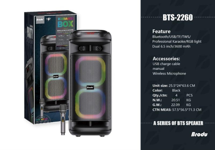 اسپیکر BTS 2260 یک اسپیکر جمع و جور ولی با صدای فوق العاده بلند و با کیفیت است که می تواند صدایی با قدرت ۴۵۰۰ را تولید کند.