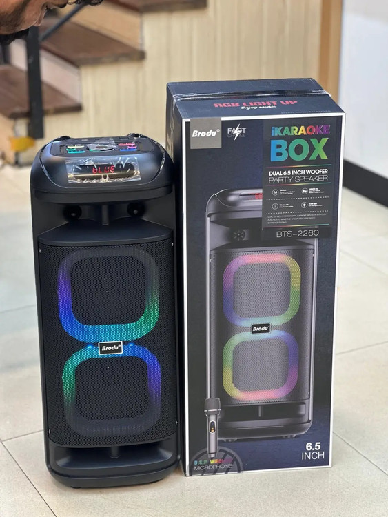 داخل باکس این اسپیکر دو عدد میکروفن وایرلس قرار دارد که می توانید توسط آن لحظات مفرحی رو به خوانندگی و شنیدن موسیقی بپردازید.