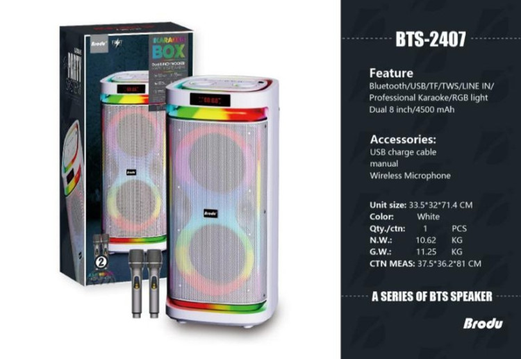 اسپیکر قابل حمل BTS 2407 یک اسپیکر جمع و جور ولی با صدایی فوق العاده بلند و با کیفیت است که می تواند صدایی با قدرت 4500 وات پمپو را تولید کند.این اسپیکر از بلوتوث پشتیبانی کرده و دارای درگاه فلش ، مموری و ای یو ایکس می باشد.این اسپیکر دارای پارتی لایت بسیار زیبا و حساس به صدا است.داخل باکس این اسپیکر دو عدد میکروفن وایرلس قرار دارد که می توانید توسط آن لحظات مفرحی رو به خوانندگی و شنیدن موسیقی بپردازید.