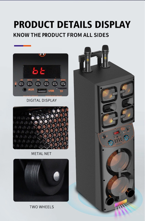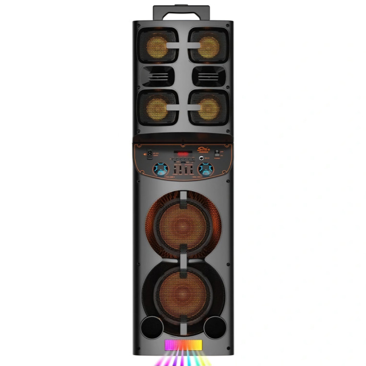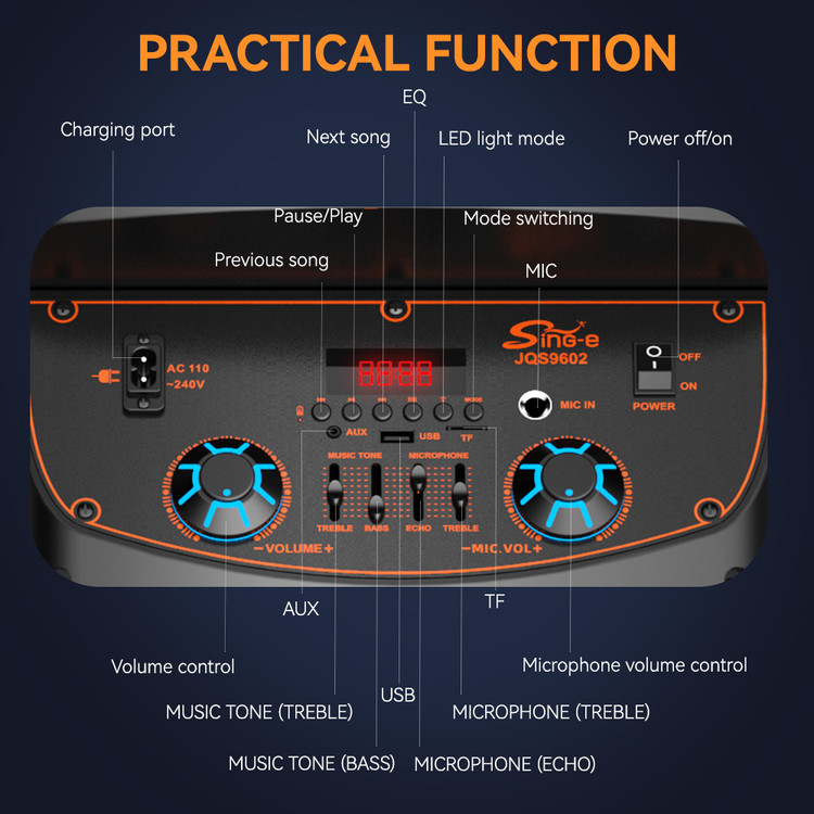هم اکنون با معرفی محصول فوق العاده پر طرفدار شرکت Zqs مدل بینظیر JQS 9602 در خدمت شما عزیزان خواهیم بود.اسپیکر قابل حمل مدل JQS ۹۶۰۲ نظر افرادی که در محیط خارج از خانه به دنبال یک اسپیکر همه فن حریف می گردند را به خود معطوف کرده است. این اسپیکر همراه با میکروفن دارای طراحی دوست داشتنی و جذاب می باشد. این اسپیکر با ارتفاع 100 سانتی متر طراحی و تولید شده است و سایز ساب آن 6.5*2 اینچ است که وزن کل اسپیکر معادل 11 کیلو گرم است. اسپیکر JQS 9602 انرژی مورد نیاز خود را از طریق باتری قابل شارژ با ظرفیت 5000 میلی آمپر تامین میکند. از نقاط مثبت این اسپیکر می توان با ظرفیت باطری بسیار بالا و همچنین قابلیت تغییر رقص نور نیز اشاره نمود.همچنین این اسپیکر دارای رادیو fm، ریموت کنترل ، میکروفون با سیم و... می باشد که انتخاب برای خرید آن را آسان کرده است.