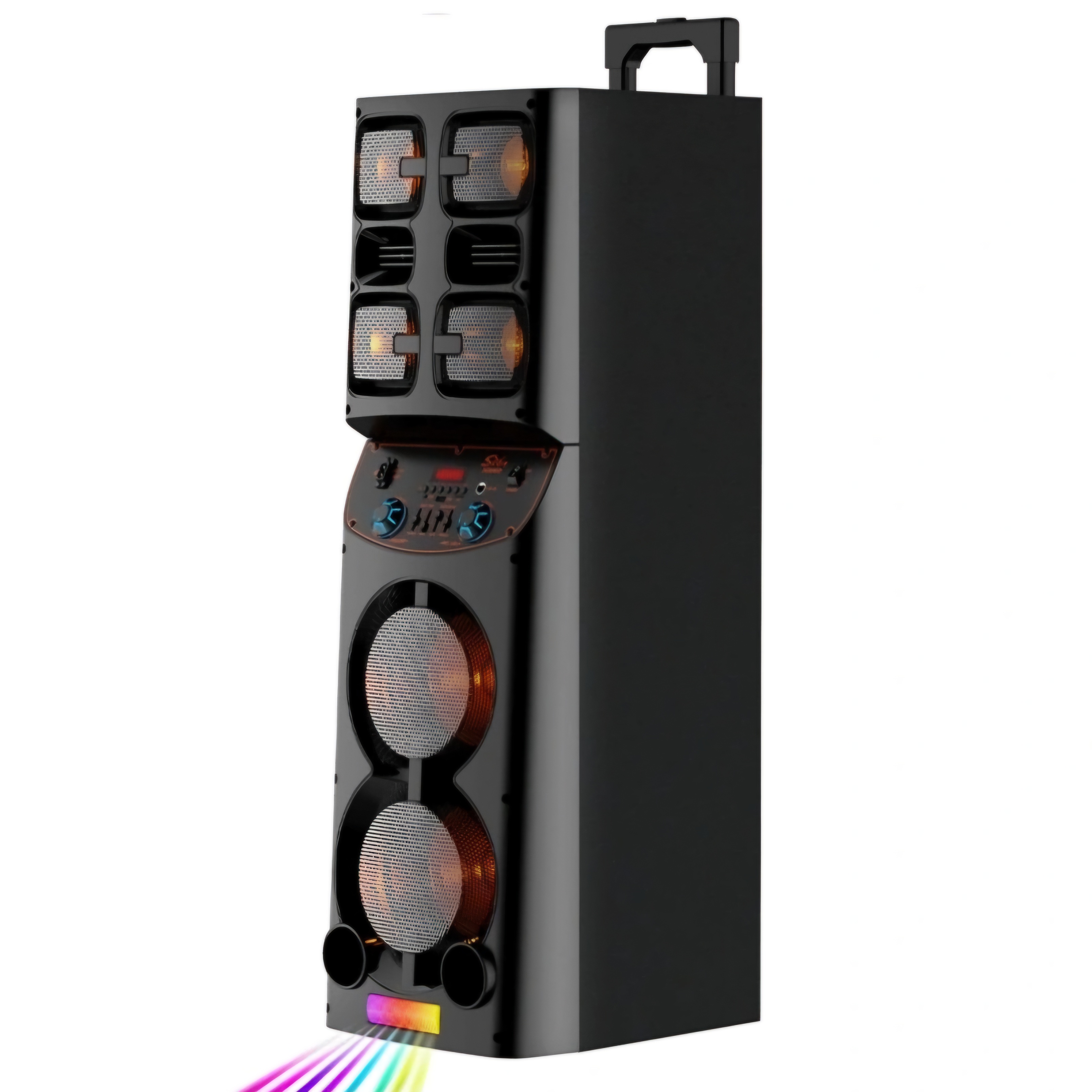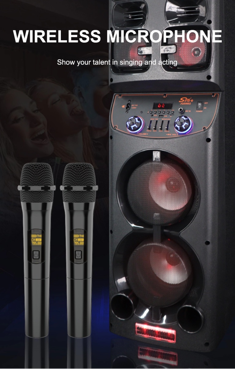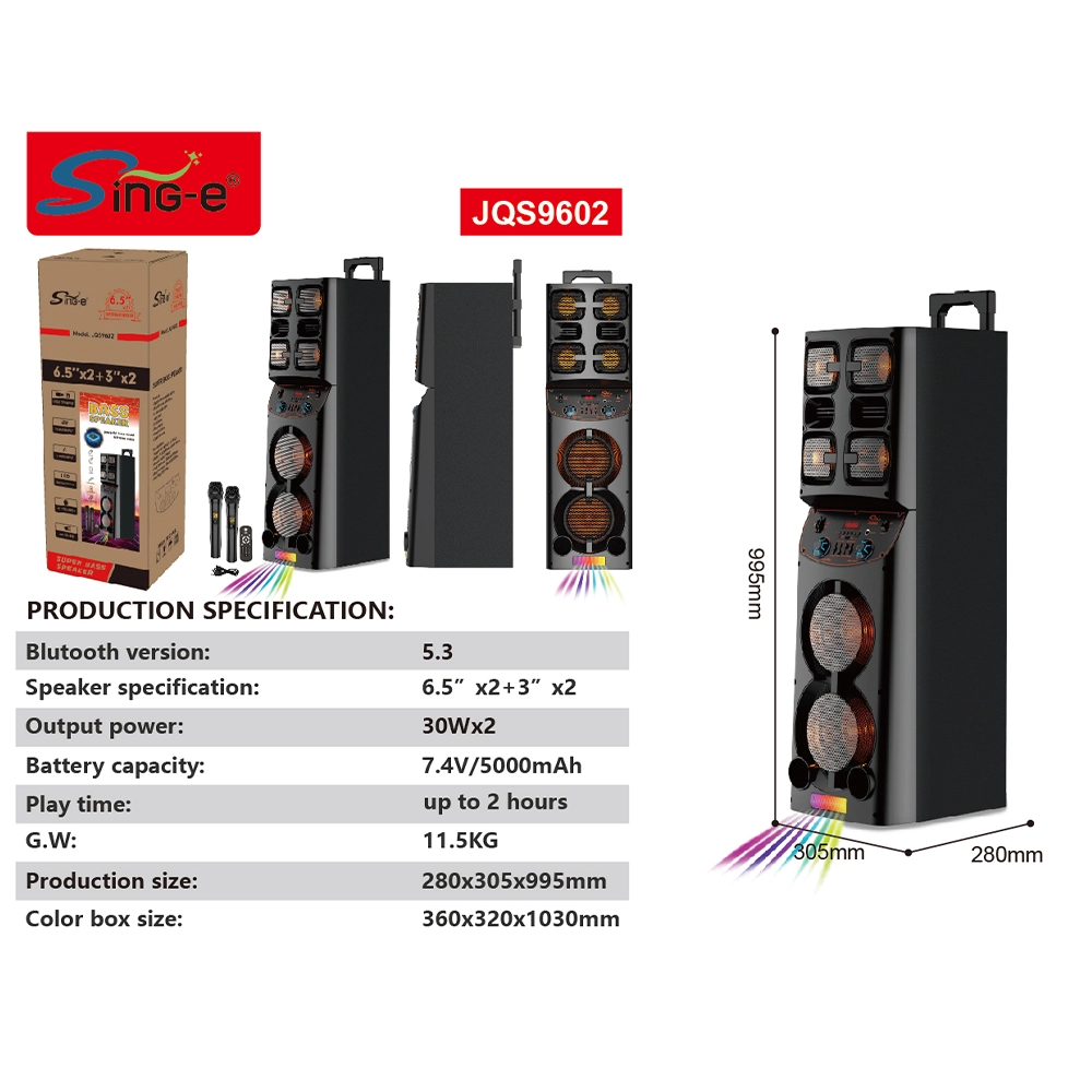 هم اکنون با معرفی محصول فوق العاده پر طرفدار شرکت Zqs مدل بینظیر JQS 9602 در خدمت شما عزیزان خواهیم بود.اسپیکر قابل حمل مدل JQS ۹۶۰۲ نظر افرادی که در محیط خارج از خانه به دنبال یک اسپیکر همه فن حریف می گردند را به خود معطوف کرده است. این اسپیکر همراه با میکروفن دارای طراحی دوست داشتنی و جذاب می باشد. این اسپیکر با ارتفاع 100 سانتی متر طراحی و تولید شده است و سایز ساب آن 6.5*2 اینچ است که وزن کل اسپیکر معادل 11 کیلو گرم است. اسپیکر JQS 9602 انرژی مورد نیاز خود را از طریق باتری قابل شارژ با ظرفیت 5000 میلی آمپر تامین میکند. از نقاط مثبت این اسپیکر می توان با ظرفیت باطری بسیار بالا و همچنین قابلیت تغییر رقص نور نیز اشاره نمود.همچنین این اسپیکر دارای رادیو fm، ریموت کنترل ، میکروفون با سیم و... می باشد که انتخاب برای خرید آن را آسان کرده است.