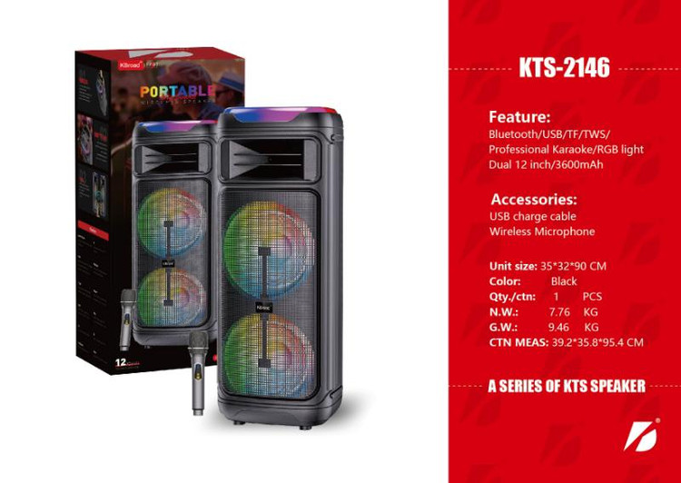 اسپیکر Kts 2146 یک بلندگوی حرفهای و قدرتمند است که برای انواع محیطها از جمله مهمانیها، کنسرتها و استفاده شخصی مناسب میباشد. این اسپیکر با طراحی مدرن و جذاب، علاوه بر زیبایی ظاهری، کیفیت صدای بسیار بالایی ارائه میدهد. توان خروجی بالای آن باعث میشود صدا با قدرت و وضوح عالی در فضا پخش شود. باس قدرتمند و عمیق این اسپیکر، تجربه شنیداری بینظیری را برای کاربران فراهم میکند. همچنین، krs 2146 قابلیت اتصال هم به صورت بیسیم (بلوتوث) و هم به صورت با سیم دارد که استفاده از آن را بسیار آسان میکند. بدنه مقاوم و سبک این اسپیکر، حمل و نقل را راحت کرده و آن را برای استفاده در فضای باز و بسته مناسب میسازد. علاوه بر این، سیستم خنککننده داخلی باعث میشود که دستگاه در طول زمان استفاده طولانیمدت، عملکرد پایداری داشته باشد. کنترلهای ساده و کاربرپسند روی دستگاه، امکان تنظیم صدا و انتخاب ورودیها را برای کاربران فراهم میکند. در مجموع، kts 2146 گزینهای عالی برای کسانی است که به دنبال اسپیکری با کیفیت بالا، طراحی زیبا و قابلیتهای متنوع هستند. این محصول ترکیبی از قدرت، کیفیت و کارایی را در یک بسته بزرگ ارائه میدهد.