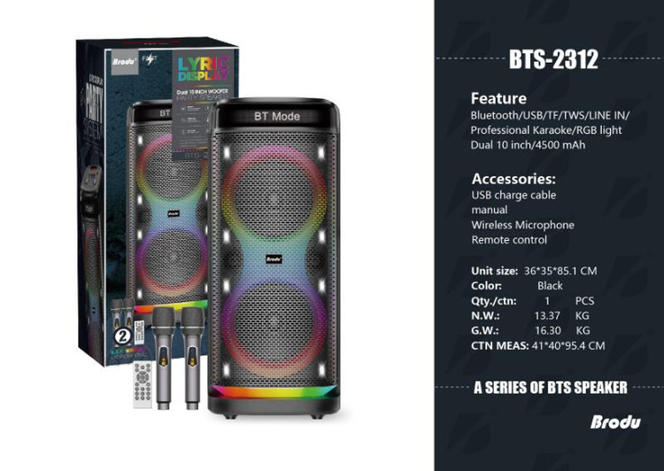 اسپیکر و قدرتمند و قابل حمل Bordu bts-2312می توانید مهمانی را با صدای قدرتمند و نمایش نور پویا و تمام عیار شروع کنید. این دستگاه ، با صدای قدرتمند و باس عمیق همراه با ولوم اکو و دیلی ، برای هر مهمانی، محتوای جدیدی به ارمغان می آورد. همچنین مجموعه ای از فن آوری های پیشرفته مانند بلوتوث را در خود دارد. استفاده از میکروفون اسپیکر جهت آواز. پشتیبانی USB، AUX، رادیو ، HD Sounds ، تکنولوژی میک پری و... از جذابیت های دیگر این اسپیکر می باشد.